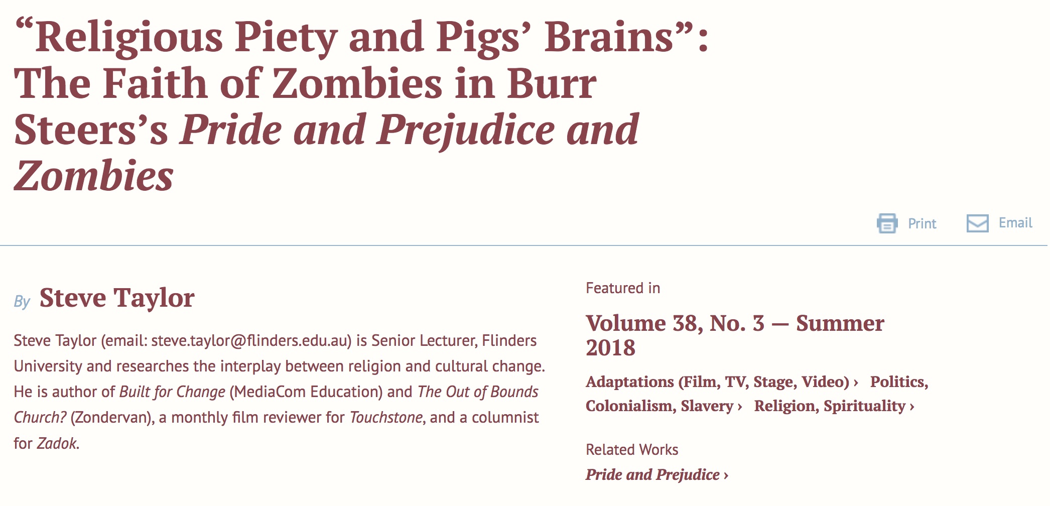 “Religious piety and pigs’ brains”: the faith of zombies in Burr Steers’s Pride, Prejudice and Zombies,” Persuasions On-Line 38 (3), 2018.